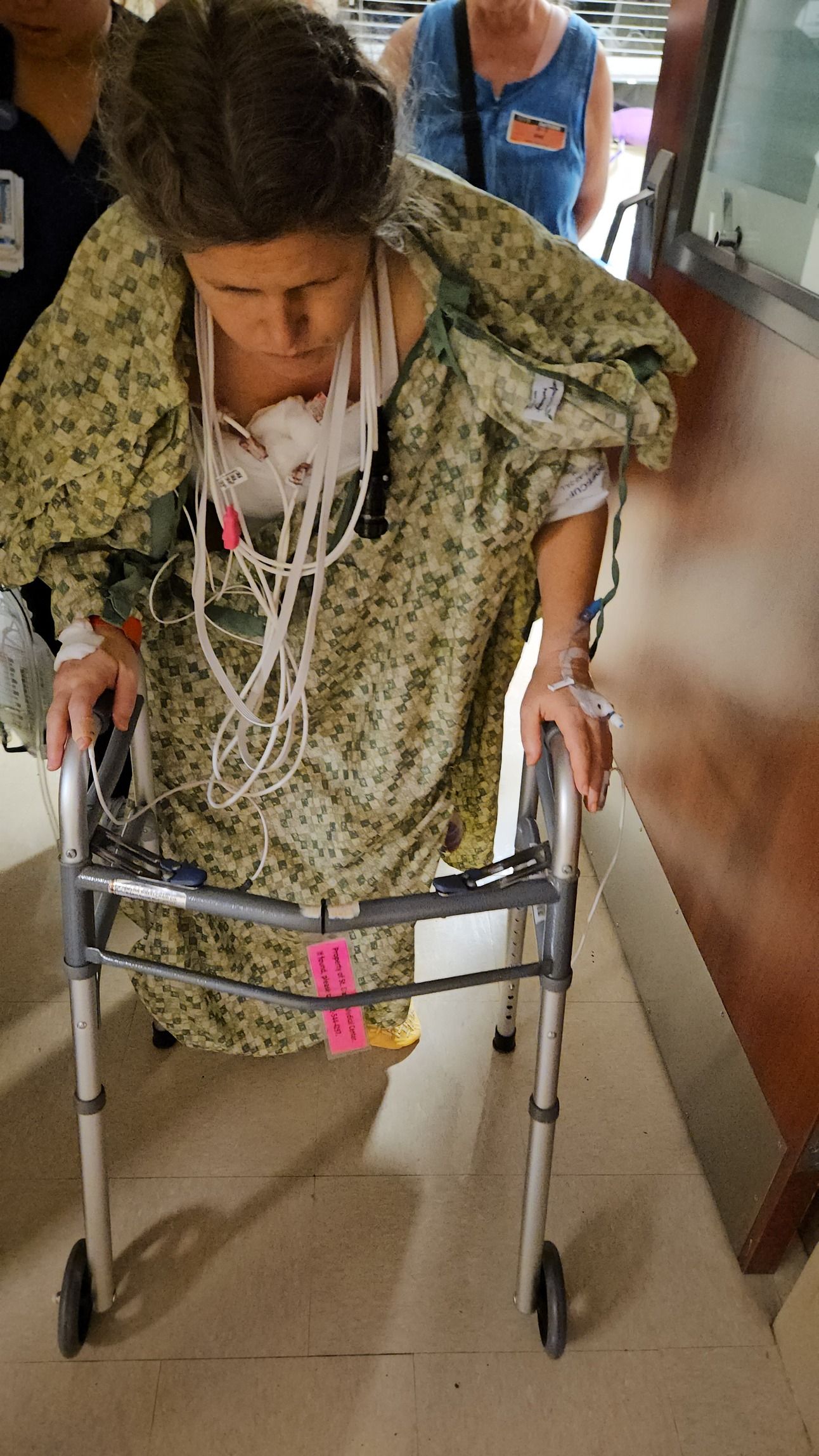 Keeping the incision closed. So since they “fileted” me in half and pulled my abdominal skin down to close it, it was critical I kept my body folded at a 30-45 degree angle at all times, so the incision would stay closed. So that meant, sleeping, eating, walking, etc. bent at all times. Down below is a picture of me walking with my walker. Talk about a glut work out! To minimize back pain, I had to walk with my knees bent in a hunch back position, with putting weight onto your heels. Man, it was a work out to walk. And they wanted me walking ASAP (to keep the blood flowing). I had to get up and walk 4-6 times/day! I also learned they considered me one of their shorter patients who needed a pediatric size walker for walking.